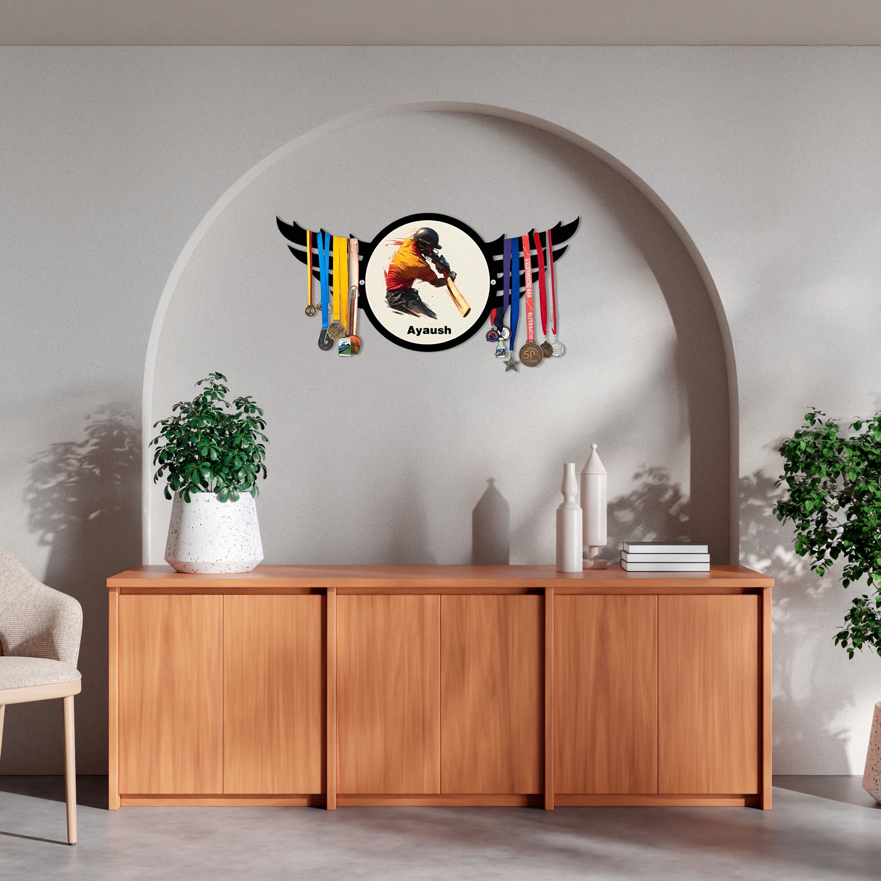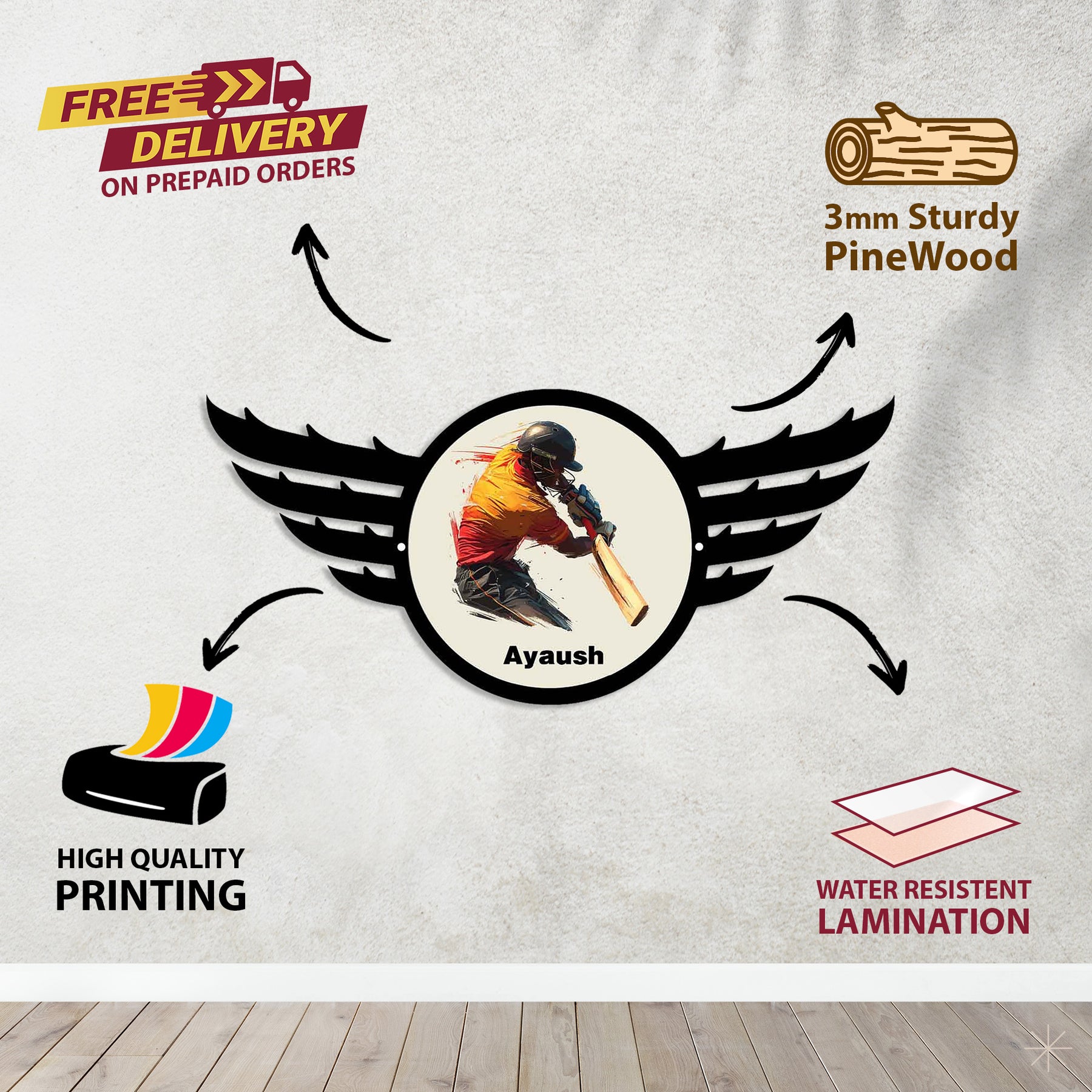 Crafted with a bold wing-inspired cricket design, this medal holder features your custom name printed at the center, creating a powerful and motivational wall display for champions. Instead of storing medals in boxes, display them with pride and let every achievement inspire the next one.