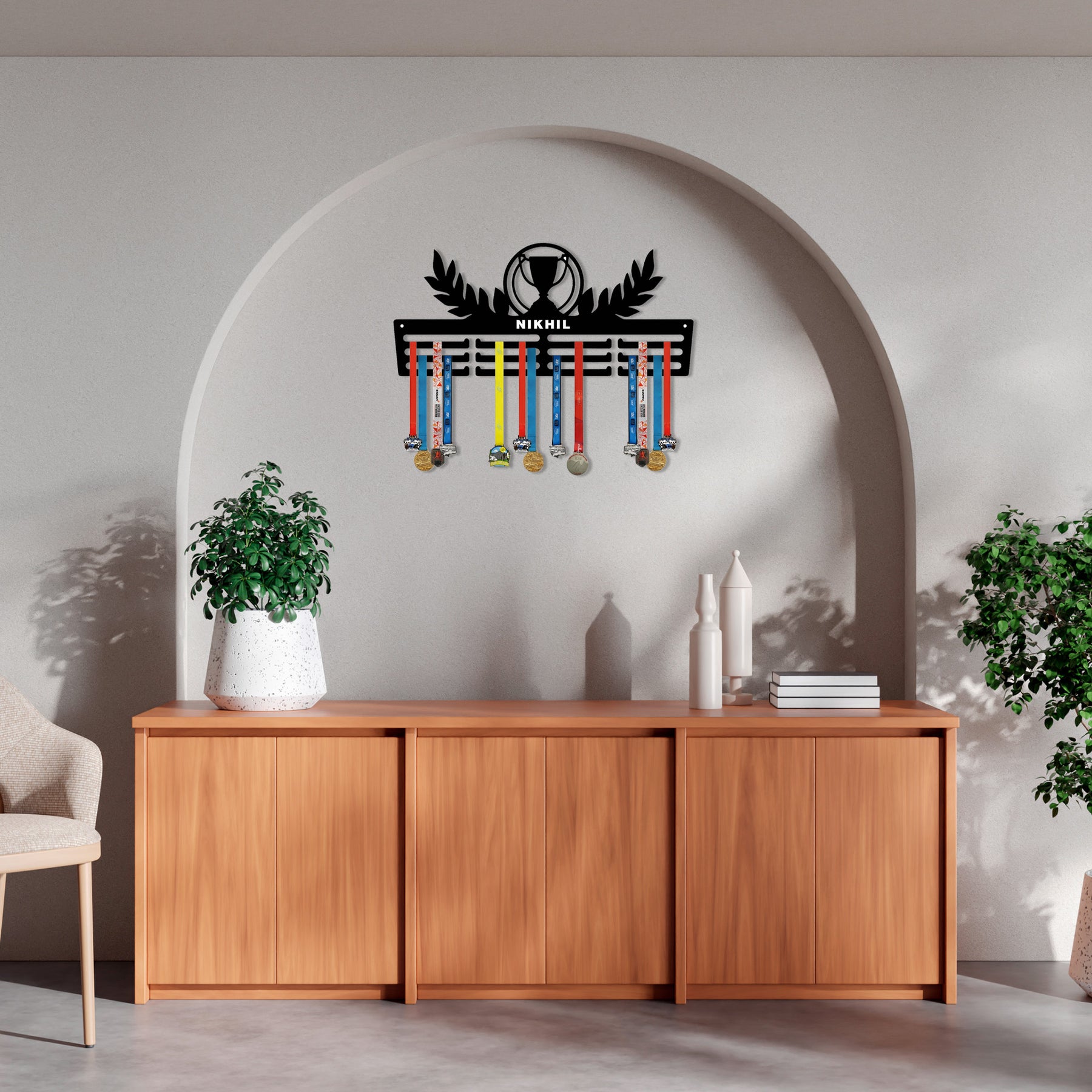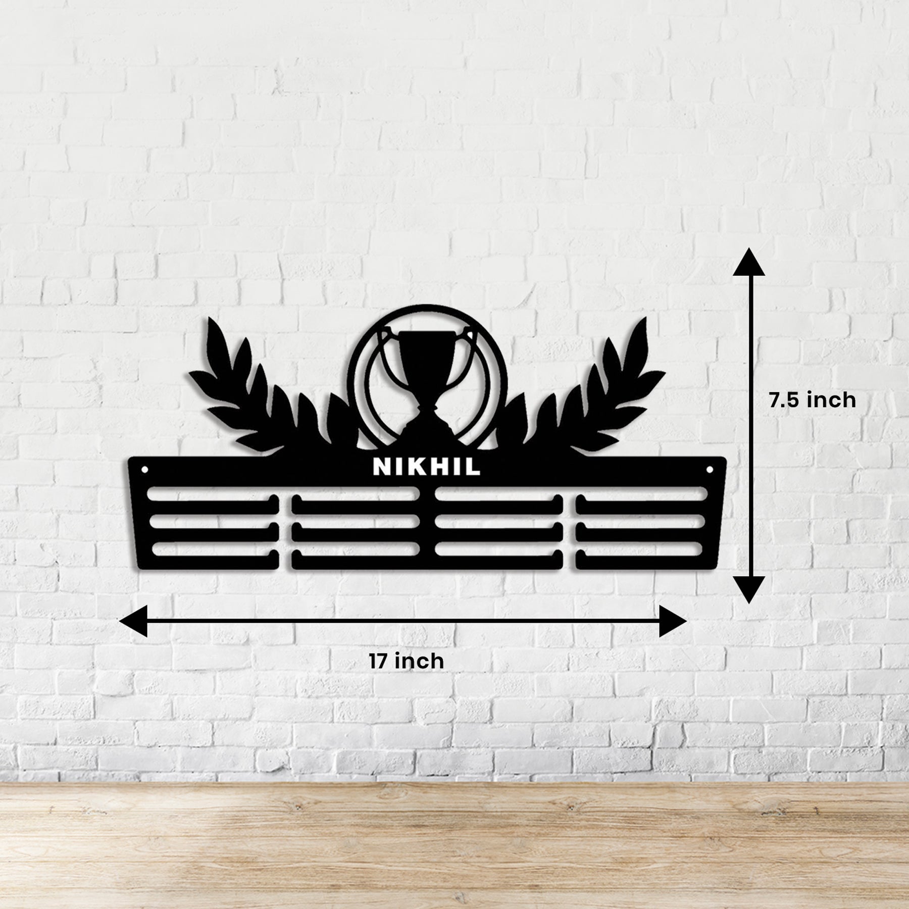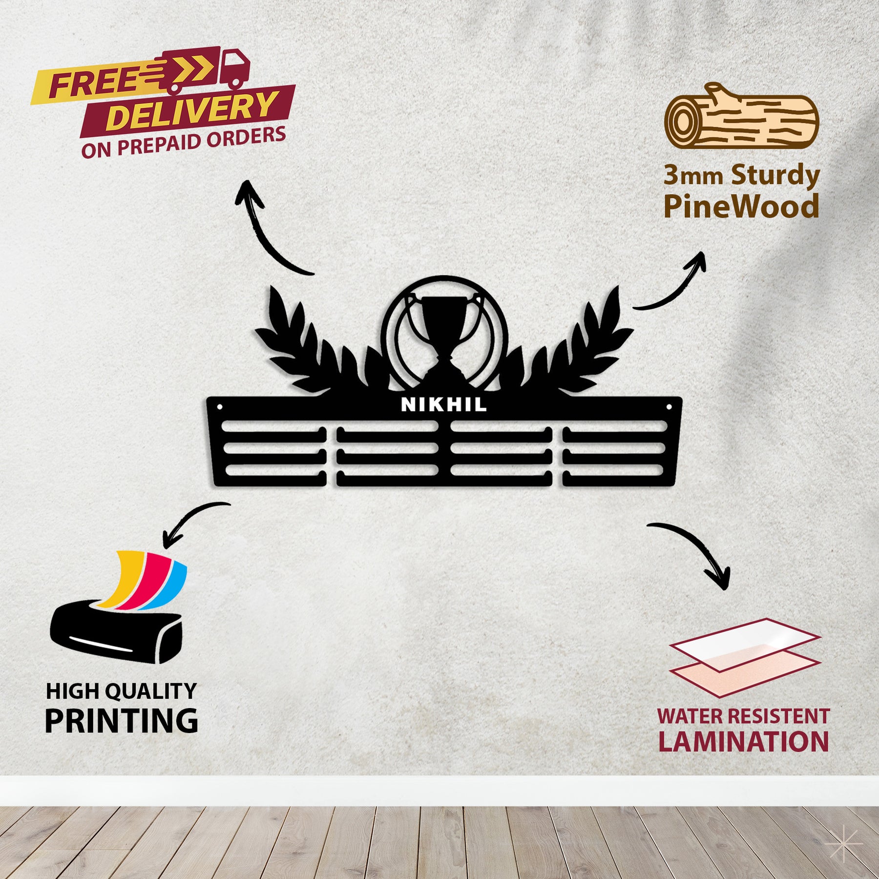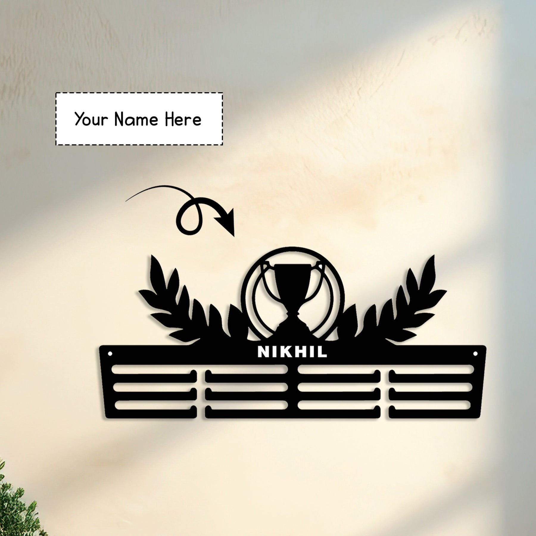 Featuring a bold trophy centerpiece with elegant laurel wings, this medal holder is customized with your name beautifully cut at the center, making it a powerful statement piece for any sports lover. Whether it’s medals from school competitions, tournaments, or professional events — display them proudly instead of hiding them away.